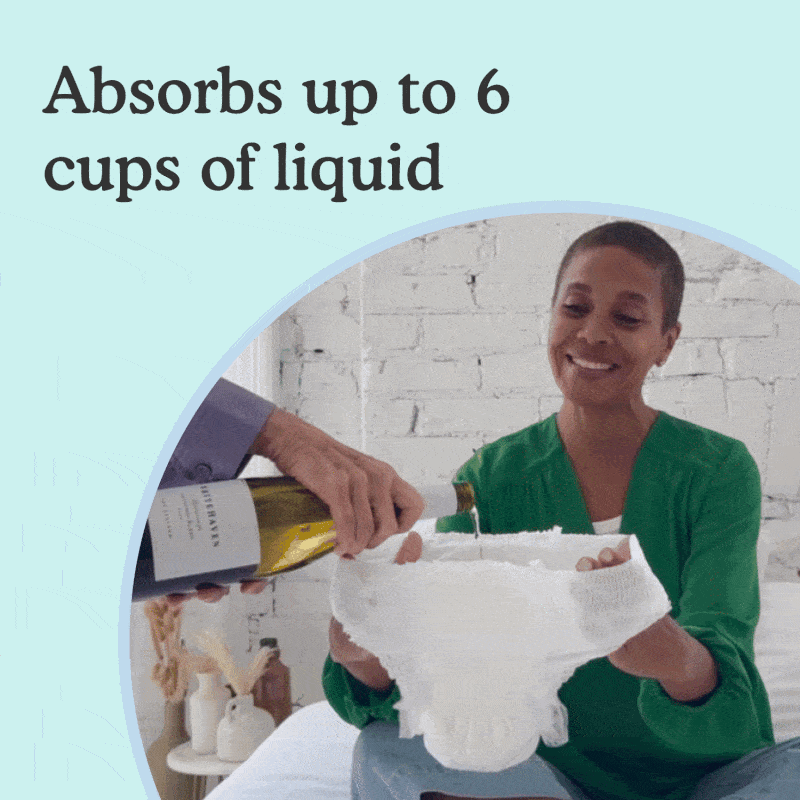 Our overnight incontinence underwear for women is designed for the absolute maximum absorbency and protection. Our overnight absorbency underwear holds up to 6 cups of liquid- that’s 37% more than Depend Night Defense. The form-fitting, underwear-like panty has a cloth-like material with breathable panels that is soft against the skin. It also has a double absorption core and reinforced leakage guards that help prevent leakage even when lying down.