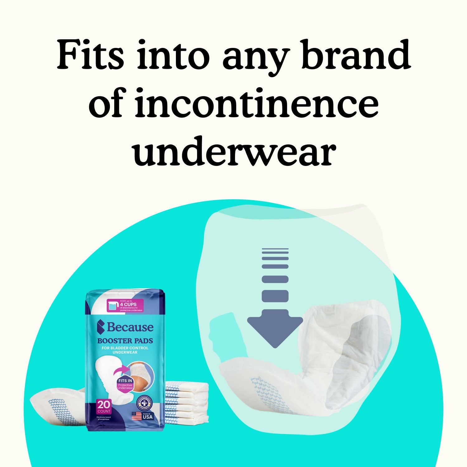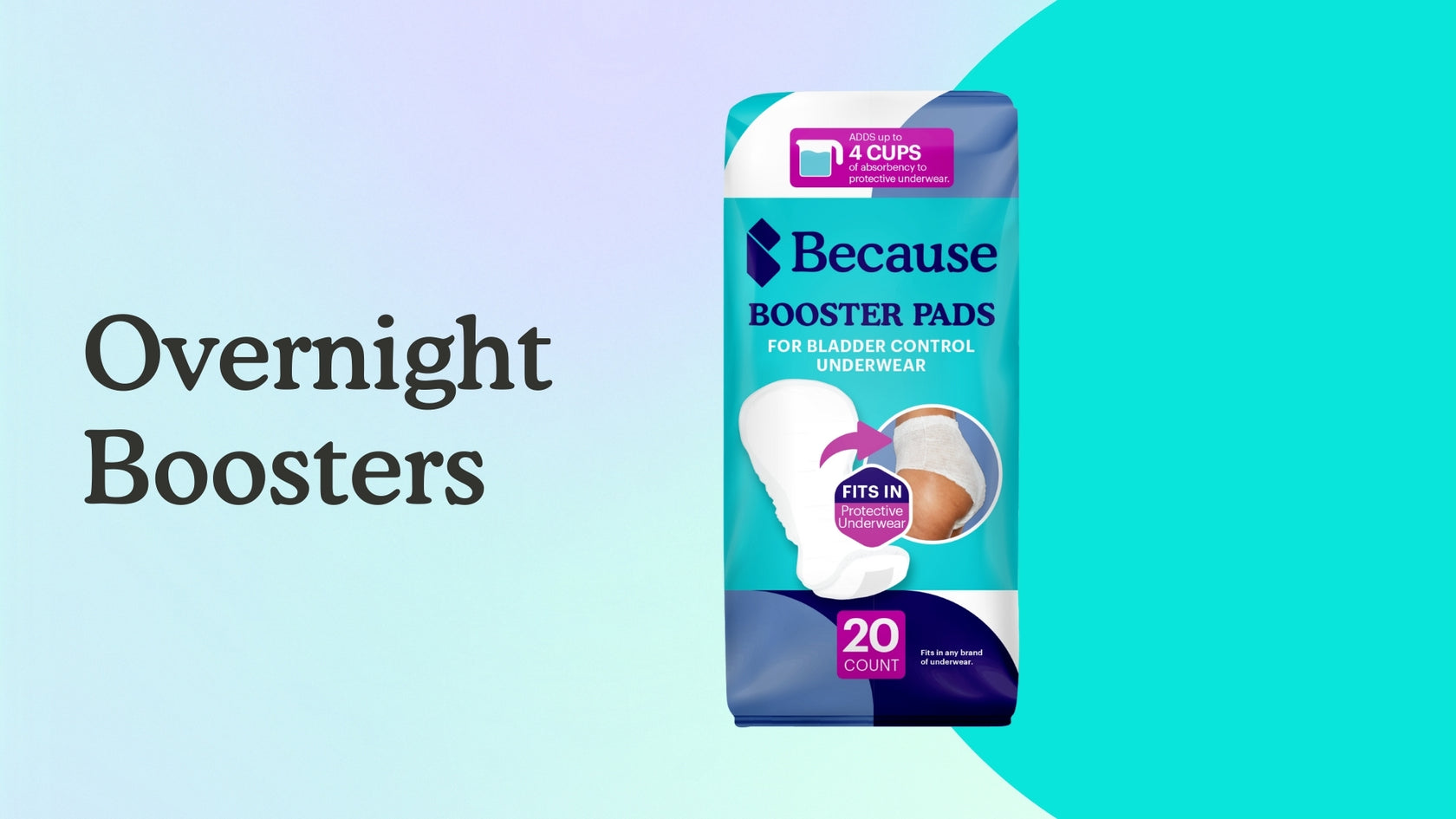 An incontinence booster is a pad-shaped insert that can be added to an adult diaper to increase absorbency. Because Premium Overnight Boosters add up to 4 extra cups of absorbency and Because Maximum Boosters add 2 cups of absorbency to any incontinence underwear.